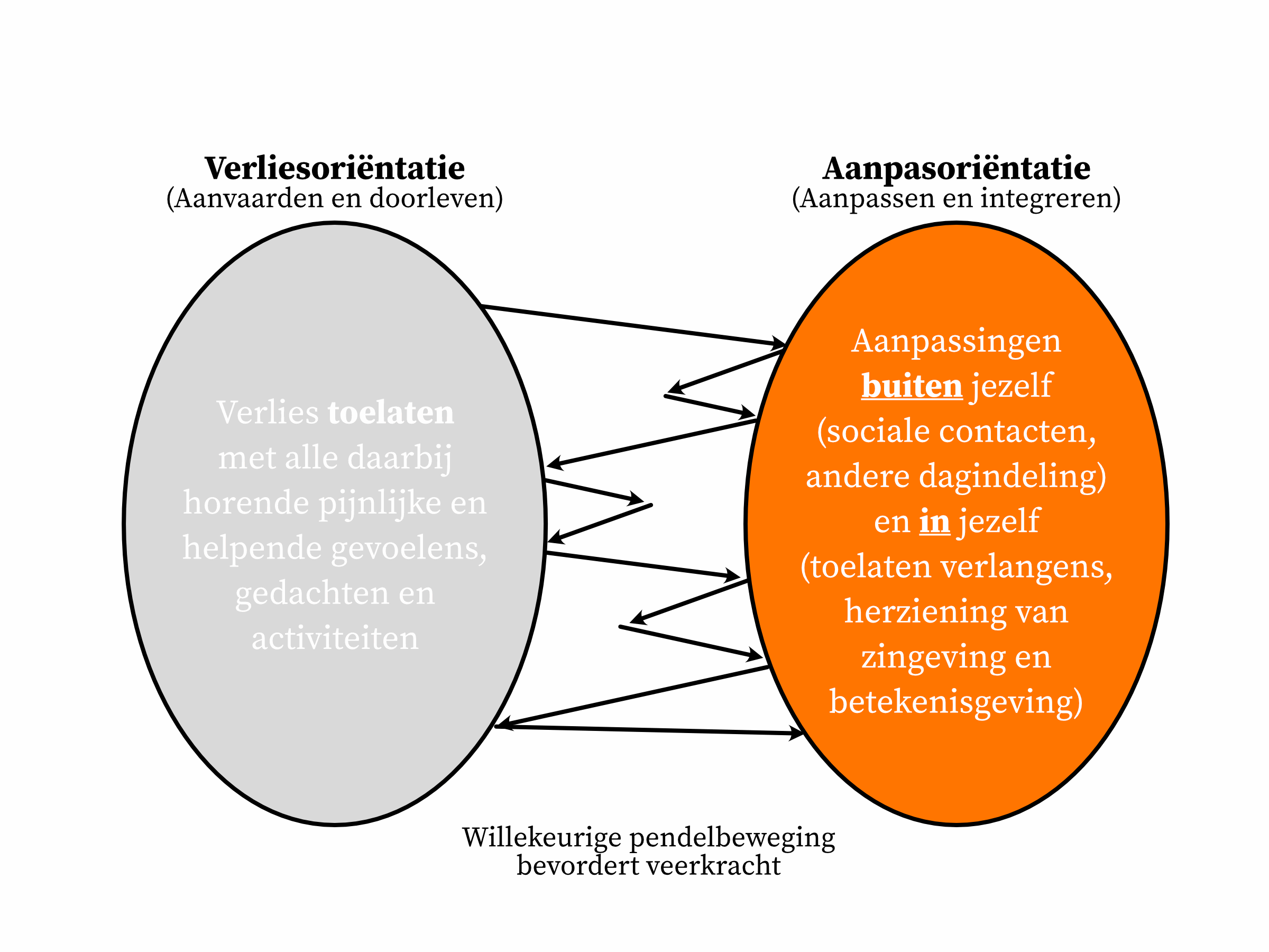 Een model dat mij helpt om dat beter te begrijpen, is dat van Stroebe en Schut. Zij zien rouw niet als een rechte lijn, maar als een pendelbeweging tussen twee werelden: